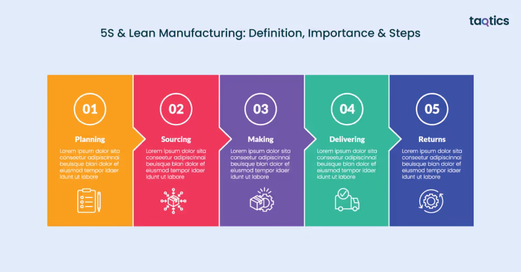 These five steps together form a continuous cycle, where sustained organization and discipline drive efficiency, safety, and quality improvements across the manufacturing process.